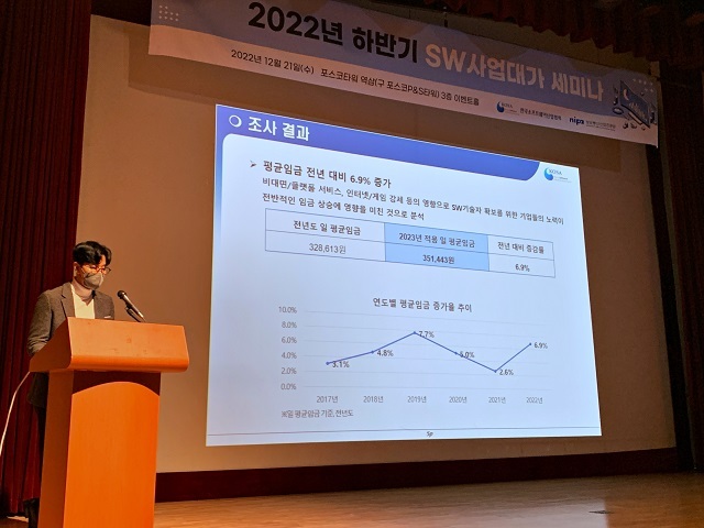 한국소프트웨어산업협회(KOSA)는 2022년 12월 21일 서울 포스코센터에서 하반기 소프트웨어(SW) 사업대가 세미나를 개최하고, 2022년 SW기술자 임금실태조사 결과를 공개했다. ​ KOSA는 올해 조사직무를 17개로 통합·개편해 조사 용이성을 개선했으며, 표본수집이 어려운 ▲IT PMO ▲IT감사 ▲IT교육강사는 조사대상에서 제외했다. 또한 모집단을 기존 SW 사업자신고 기업에서 SW사업을 영위하는 기업으로 확대해 소규모 비활성 기업에 대한 정비 및 개선을 추진했다. ​ KOSA는 개선사항을 반영해 올해 8월부터 약 두 달간 2022년 SW기술자 임금실태조사를 진행했고, 그 결과 SW기술자 일 평균임금은 전년대비 6.9% 증가한 35만1,443원이다. ​ 이번 조사는 SW사업을 영위하는 1,092..